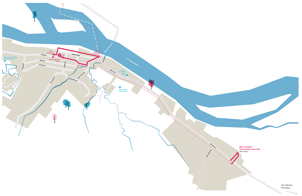 - Красный город — прогулка по городу + квест «Найди три росписи в городе» (необходимо определить поверхности, на которых возможно реализовать росписи, отобрать сюжеты. Квест может проходить в музее. Туристам выдается описание росписей и необходимо найти все три вида на территории города вместе с экскурсоводом). Точка старта квеста — Красноборский ТИЦ.
