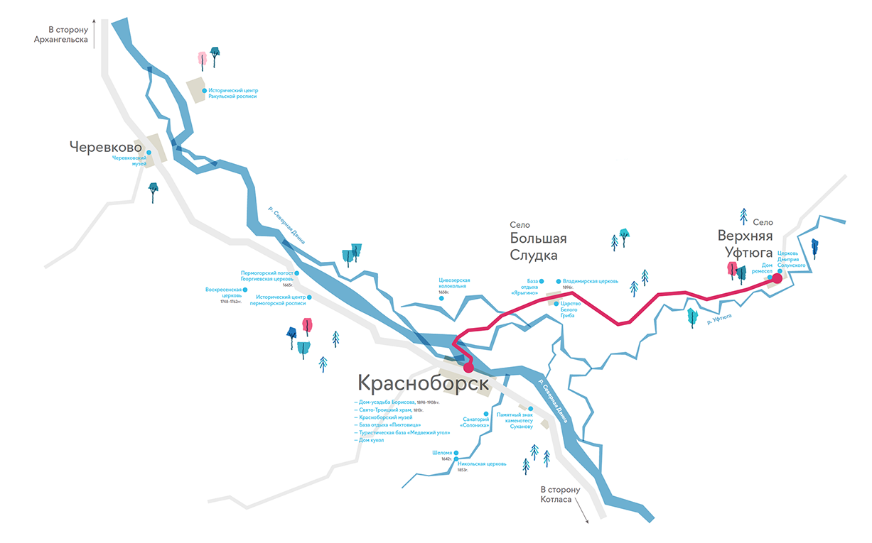 - В зависимости от погодных условий, далее маршрут может окончится в Красноборске поездкой на «Солониху», либо продолжится поездкой на Верхнюю Уфтюгу.